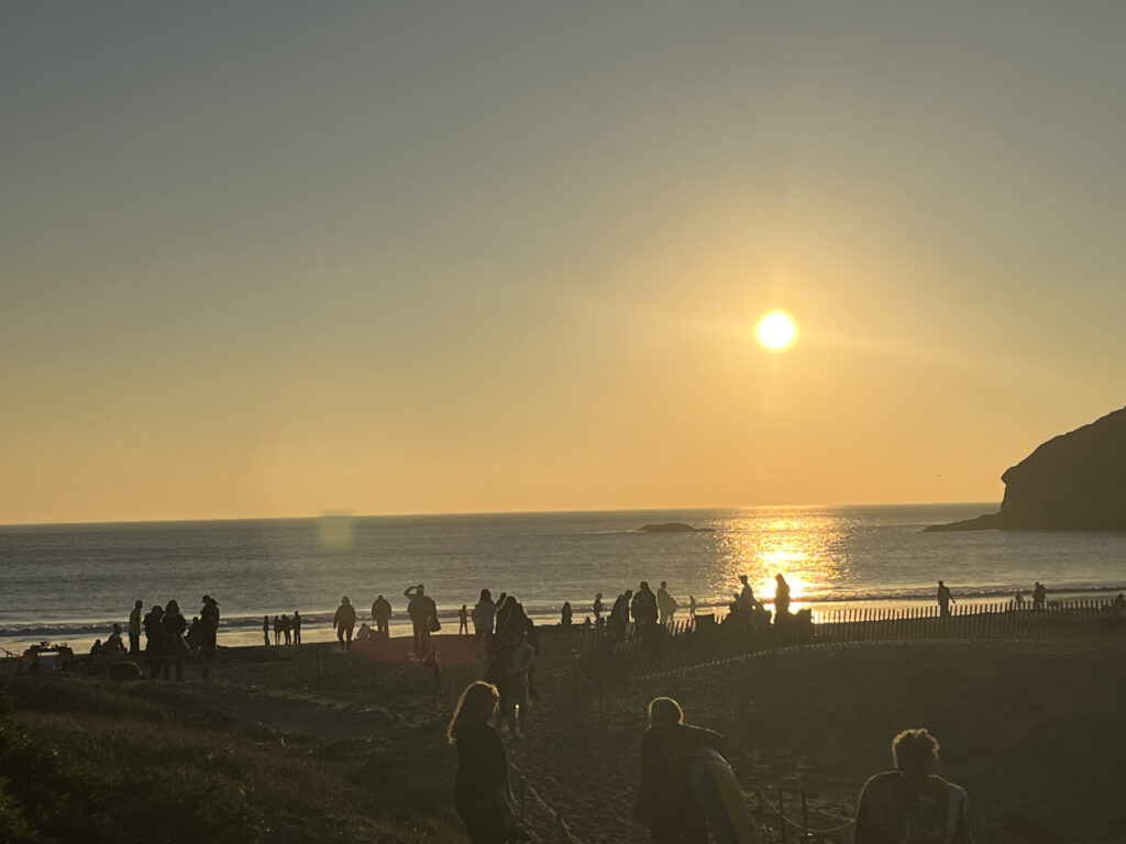 The small lagoon and wetlands nearby shelter herons, red-winged blackbirds, and monarch butterflies in season. Coastal trails rise from the beach toward sweeping views of the ocean and Mount Tamalpais beyond.